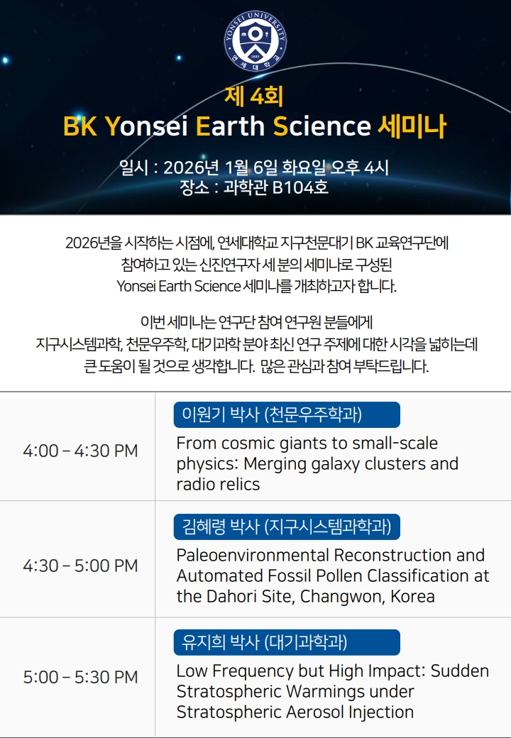 - 일시: 2026년 1월 6일 (화) 오후 4시 - 장소: 과학관 B104호 - 발표자: 이원기 박사(천문우주학과)/ 김혜령 박사(지구시스템과학과)/ 유지희 박사(대기과학과)
